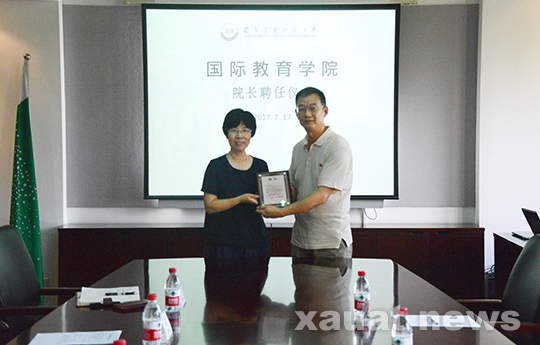 7月17日下午,我校国际教育学院院长聘任仪式在行政楼五楼会议室举行,陕西省人民对外友好协会理事王友群先生受聘为我校国际教育学院院长。校长刘晓君、副校长王树声出席了聘任仪式。组织部兼人事处处长王建斌、人事处副处长李西平、国际交流合作处处长熊仲明等部门负责人及国际教育学院常务副院长杨延龙参加了仪式,仪式由副校长王树声主持。