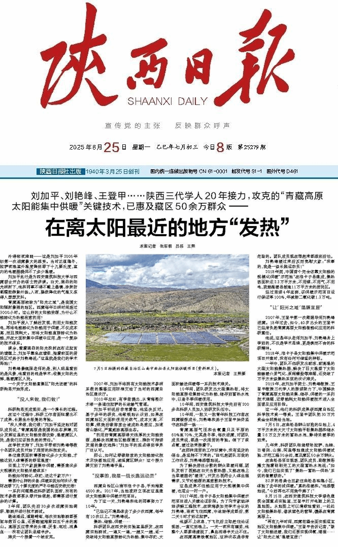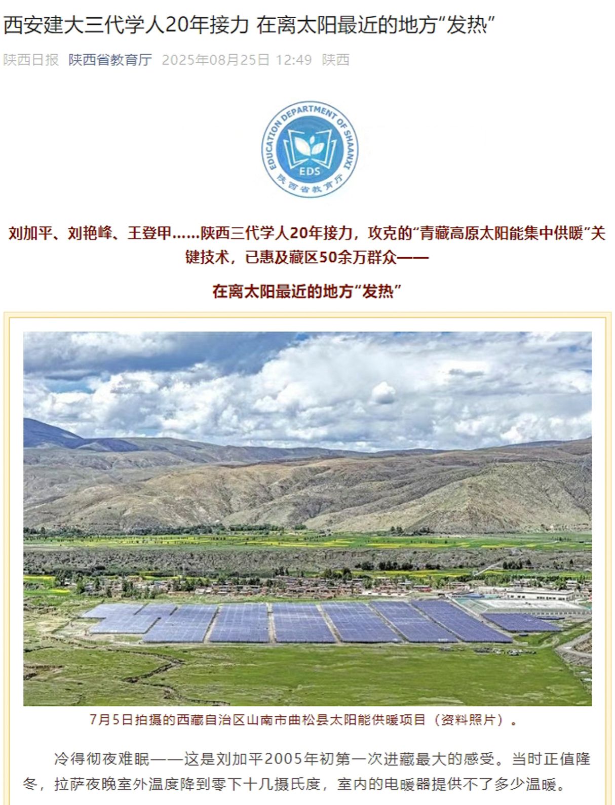 2019年,在刘加平院士、刘艳峰教授、王登甲教授三代学人的接续努力下,中国解决了青藏高原太阳能采集、储存、供暖的一系列技术难题,近零能耗太阳能供暖技术进入全面普及应用阶段。