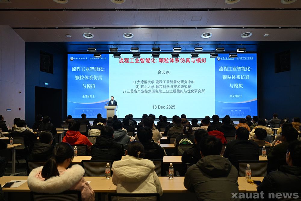 仪式结束后,余艾冰以“流程工业智能化:颗粒体系仿真与模拟”为题,为材料科学与工程学院师生作学术报告,深入阐述了颗粒体系多尺度仿真的核心理论,并结合工业实践案例,分享了模型在流程工业智能化升级中的落地路径以及对行业提质增效的核心价值,同时就报告中的相关话题与在场师生进行了深入探讨。